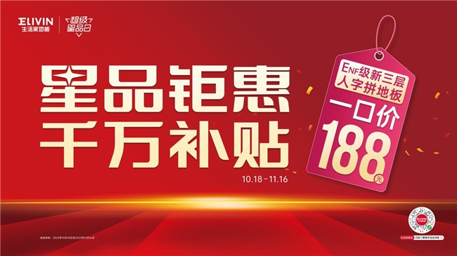 生活家地板年度重磅品牌 IP 大促第九届 “超级星品日” 即将于近期开启。这一次,生活家地板将携“千万级补贴”强势来袭,高端人字拼地板价格直接低至 188 元 /㎡,让年轻消费者实现家居装修拼法自由!