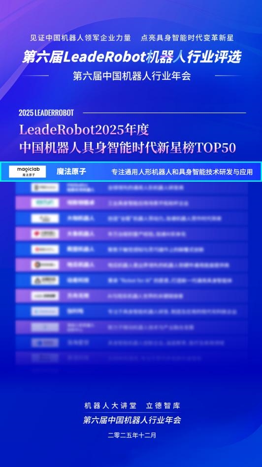 12月18日,第六届LeadeRobot中国机器人行业年会正式揭晓年度奖项,魔法原子凭借领先的技术优势与扎实的产品迭代,入选“LeadeRobot 2025年度中国机器人具身智能时代新星榜TOP50”,其高动态双足人形机器人MagicBot Z1荣获“LeadeRobot 2025年度人形机器人性能卓越奖”,充分彰显公司在具身智能领域的创新实力与产业化潜力。