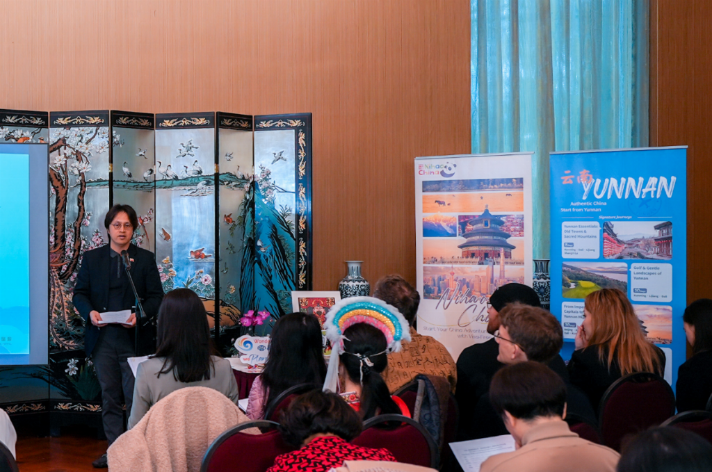 (联合国世界旅游组织专家、彼端旅游创始人林勤业在分享会上分享中国入境旅游国际传播与目的地推广实践经验,并邀请欧洲旅行商参与云南考察)