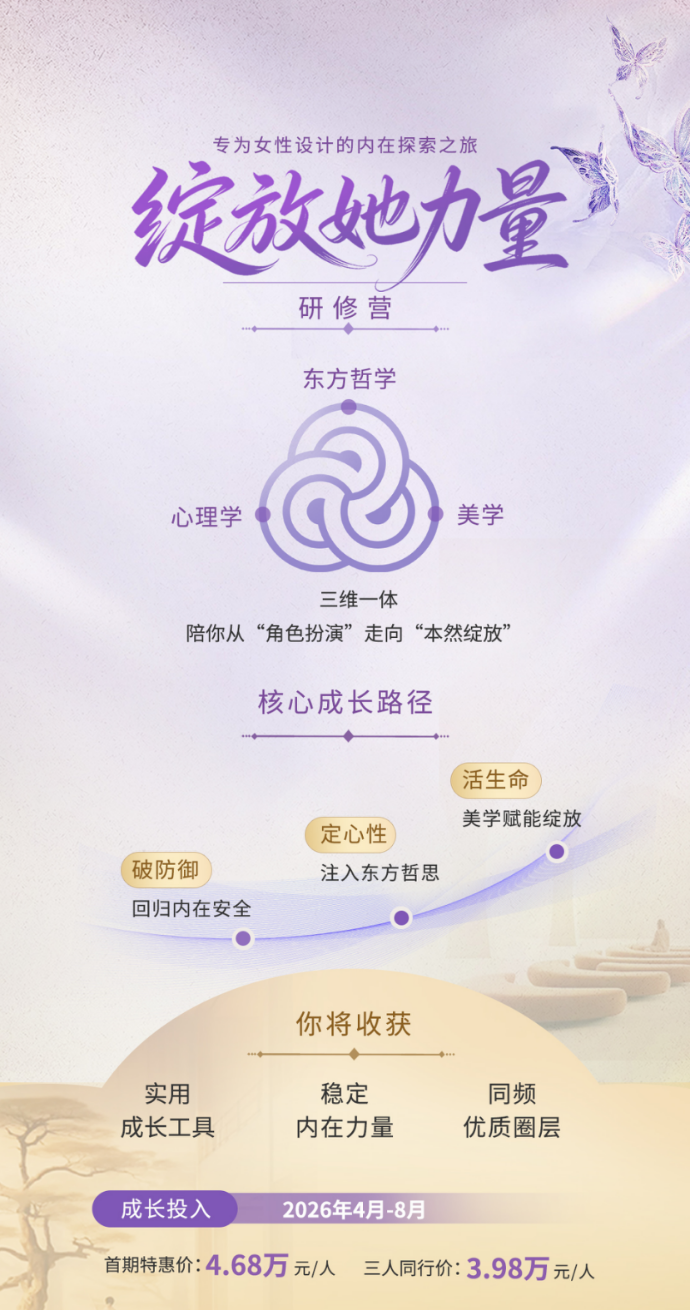 我们将融合东方哲学、心理学、美学三维一体,陪伴您完成从“破防御”到“定心性”再到“活生命”的核心成长路径。